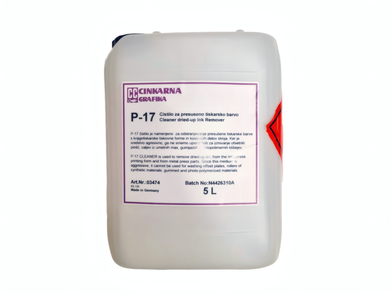 Čistilo za odstranjevanje presušene barve P-17. Sredstvo je posebej primerno za uporabo v tiskarski industriji, saj s svojim močnim učinkom temeljito odstranjuje presušeno tiskarsko barvo.